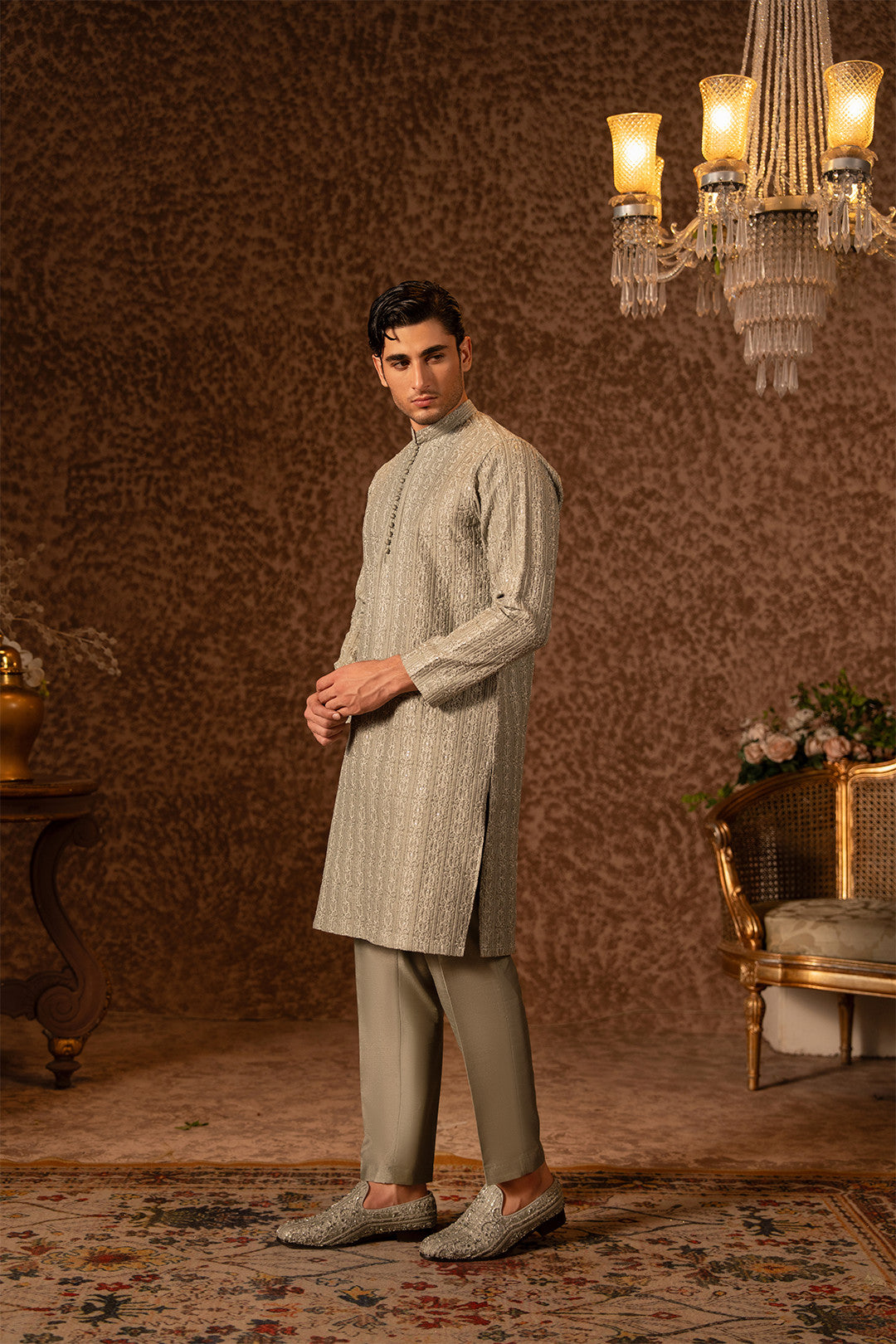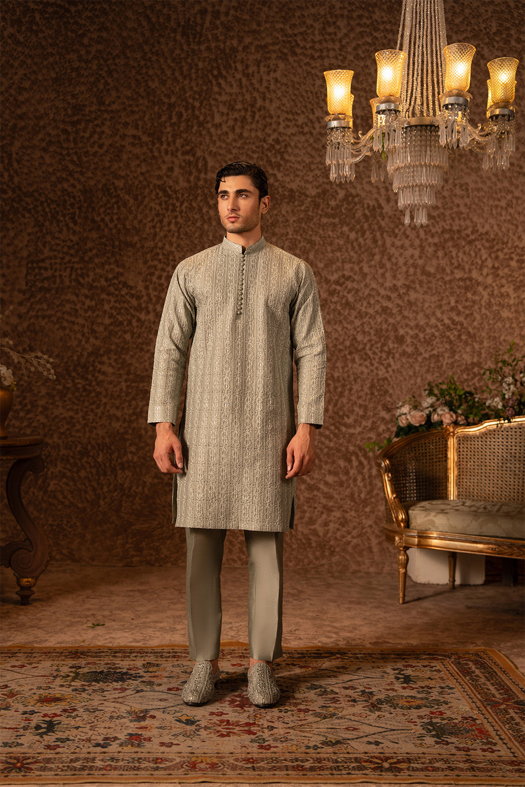 Work:This grey kurta features fine thread embroidery with subtle sequins work, adding a touch of refined shimmer. The intricate detailing enhances its modern elegance and timeless appeal, making it ideal for both festive and formal occasions.
