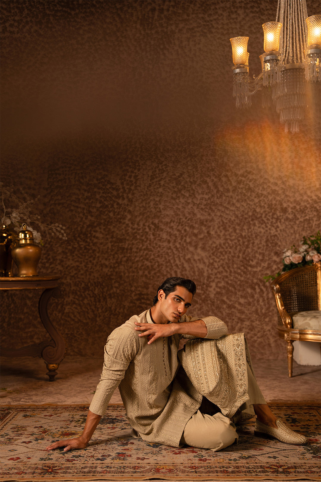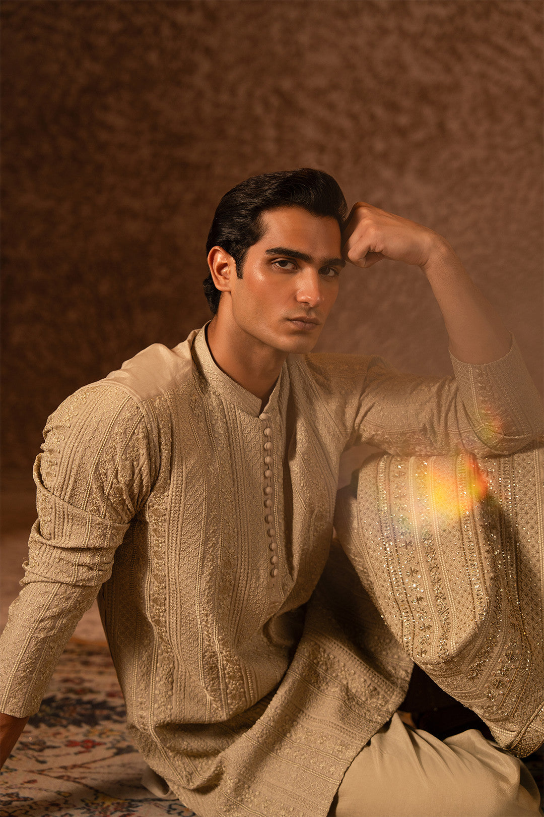 Work:This sand beige kurta features fine thread embroidery, reflecting subtle craftsmanship and refined simplicity. Its understated elegance makes it a perfect choice for both festive and formal occasions.