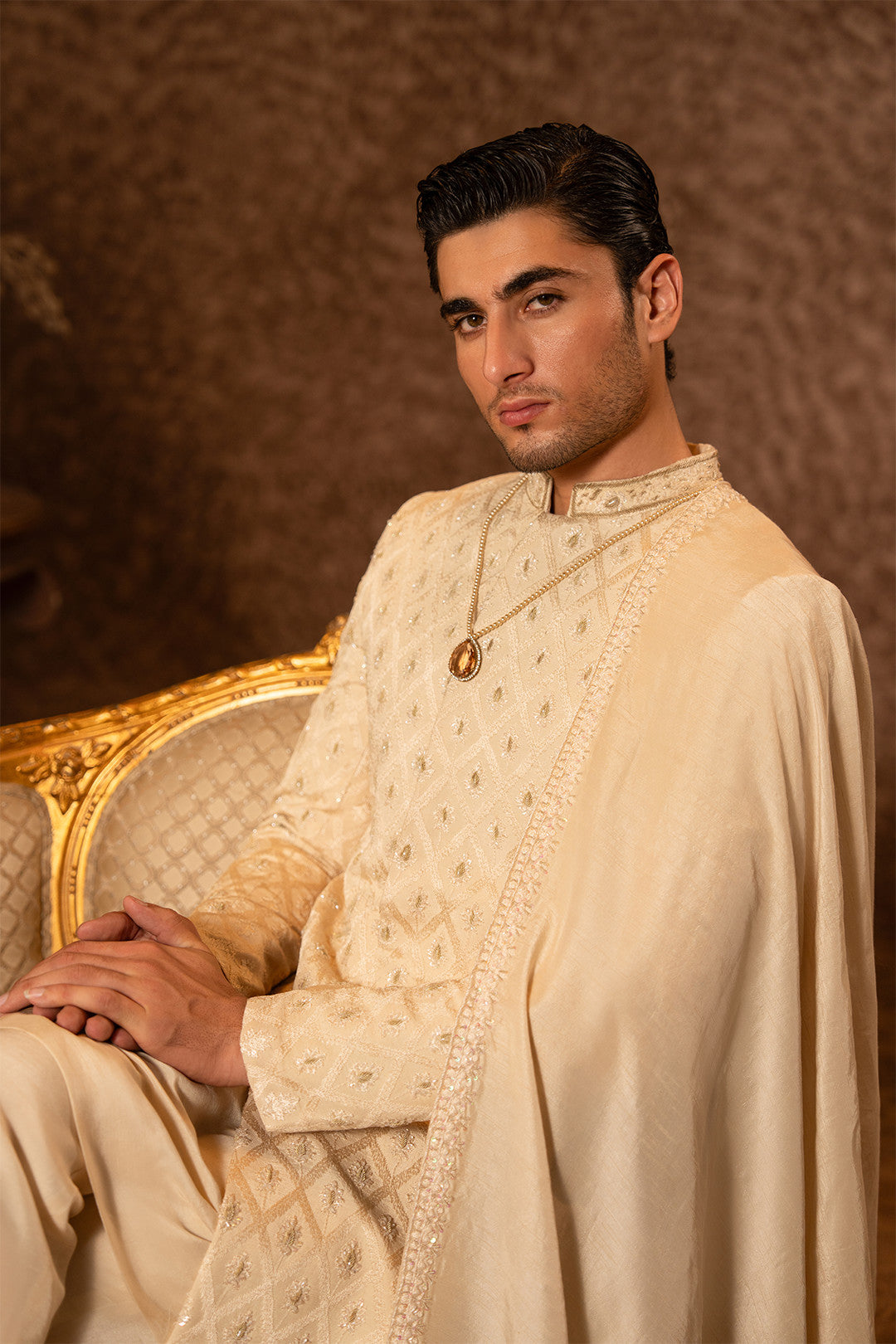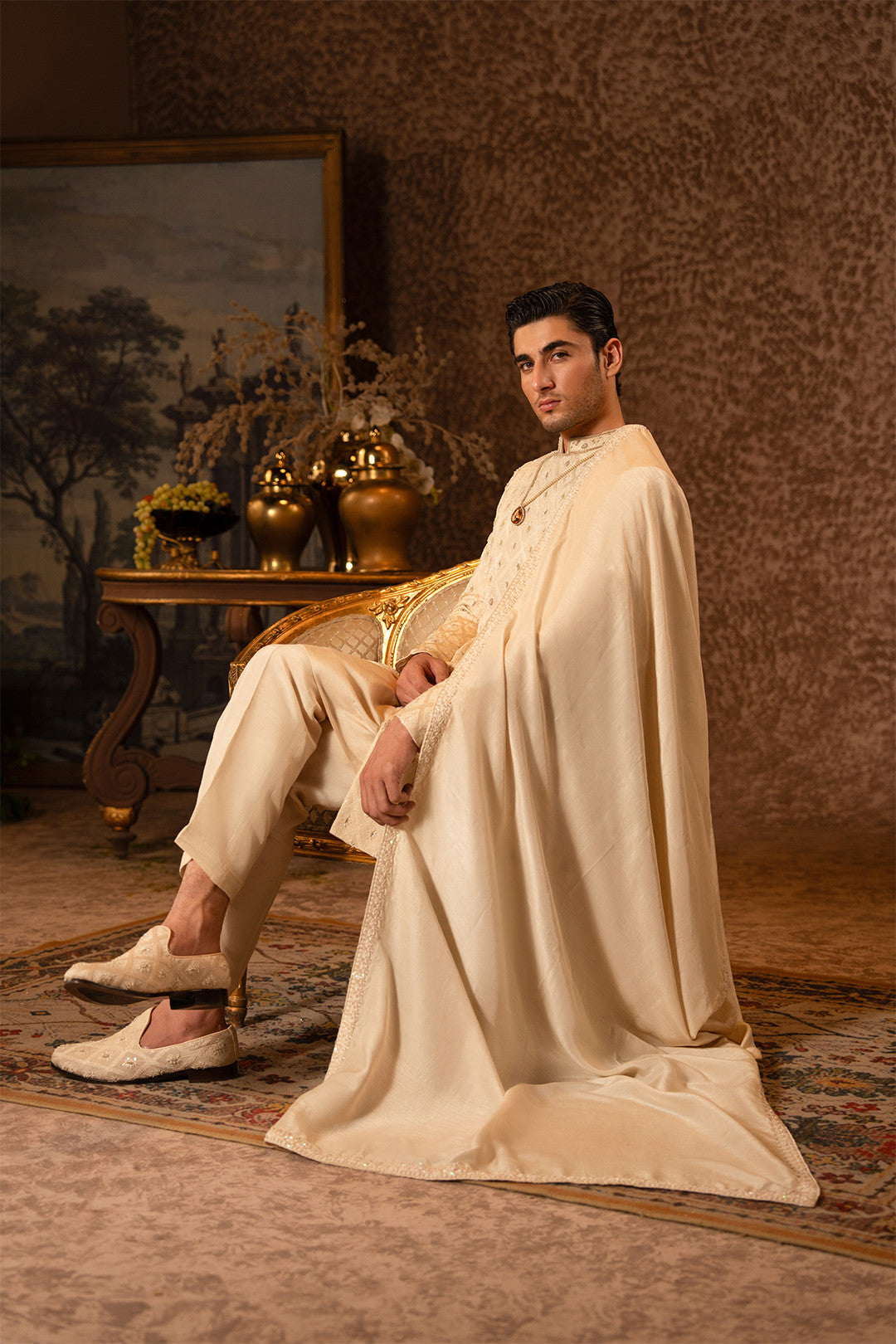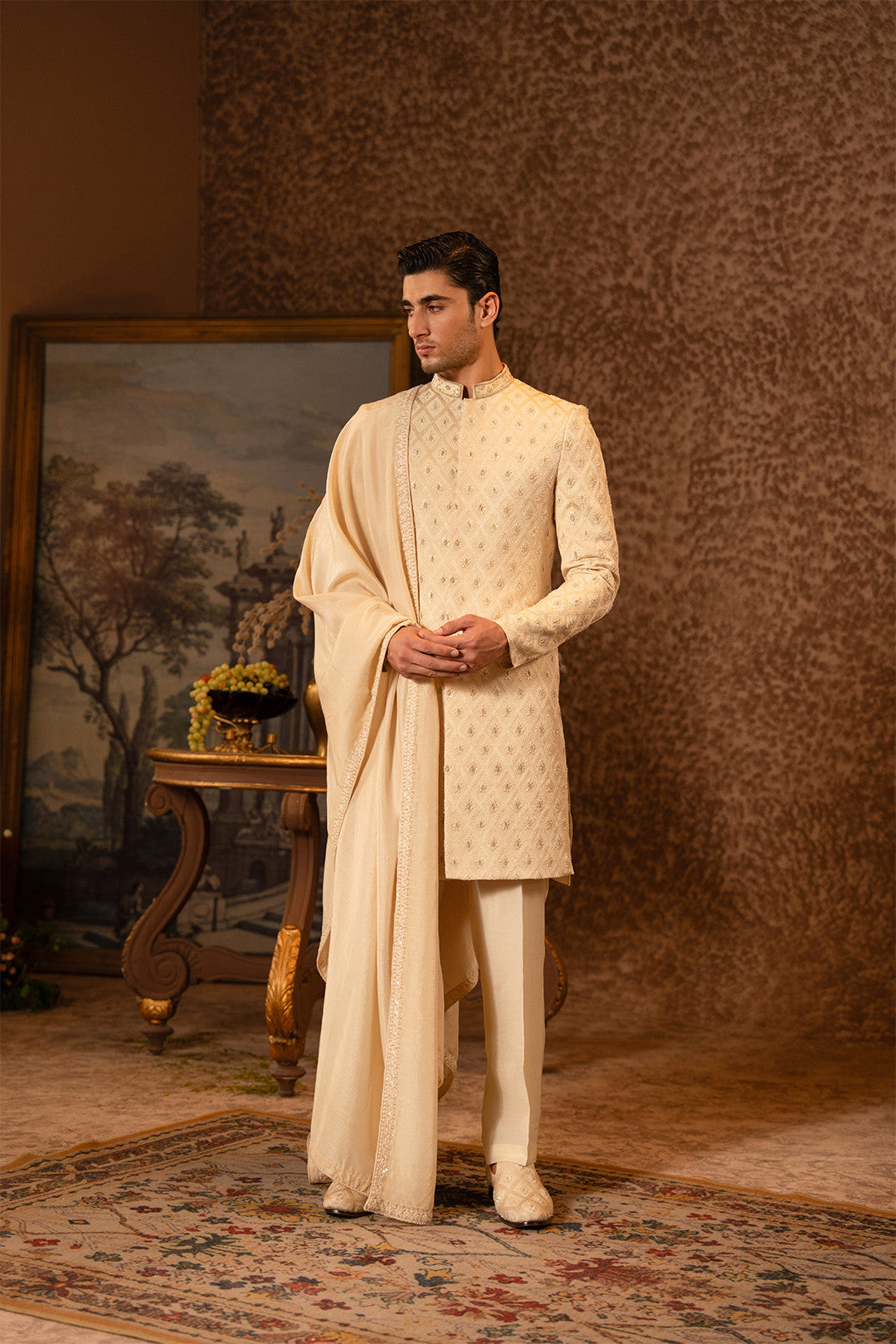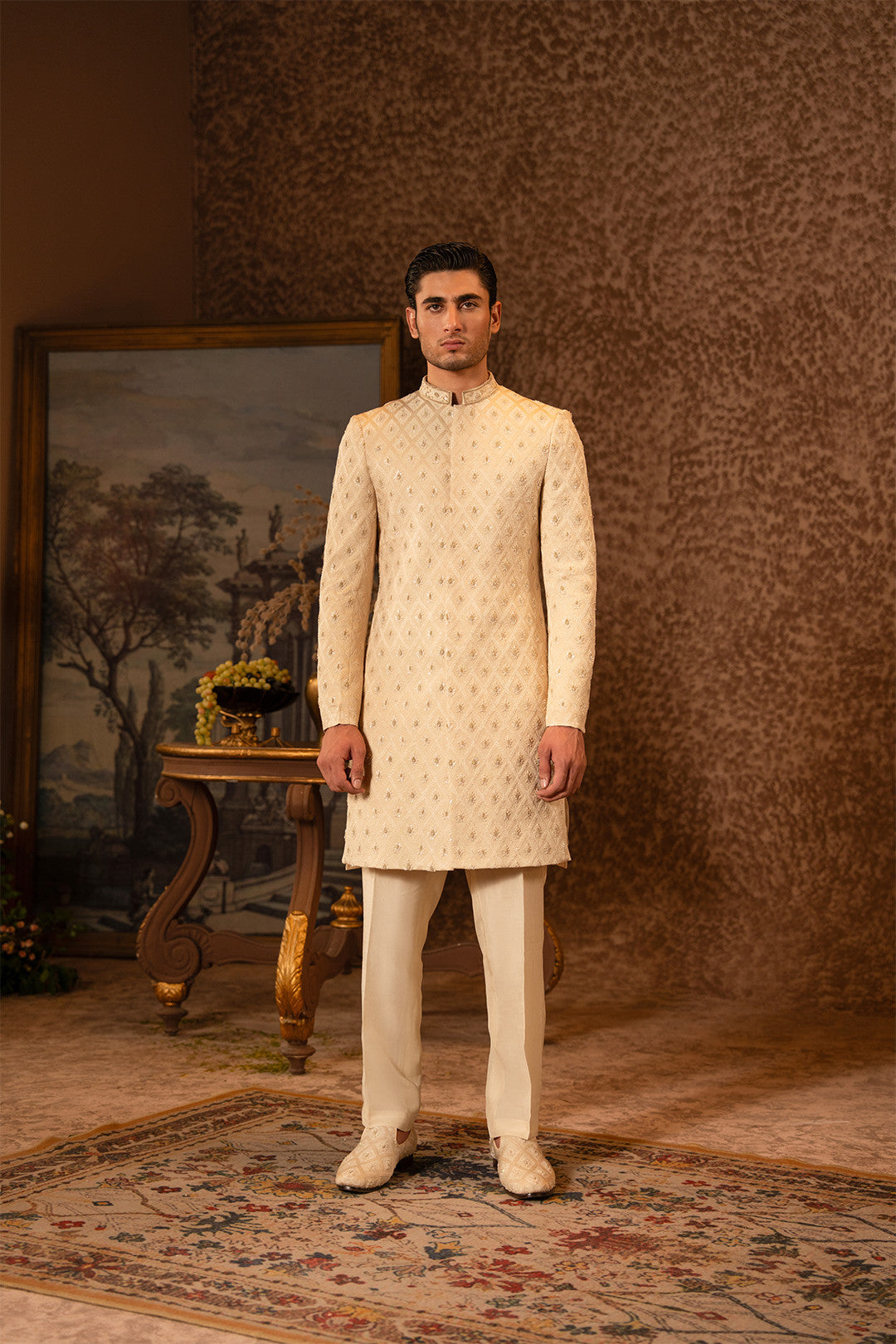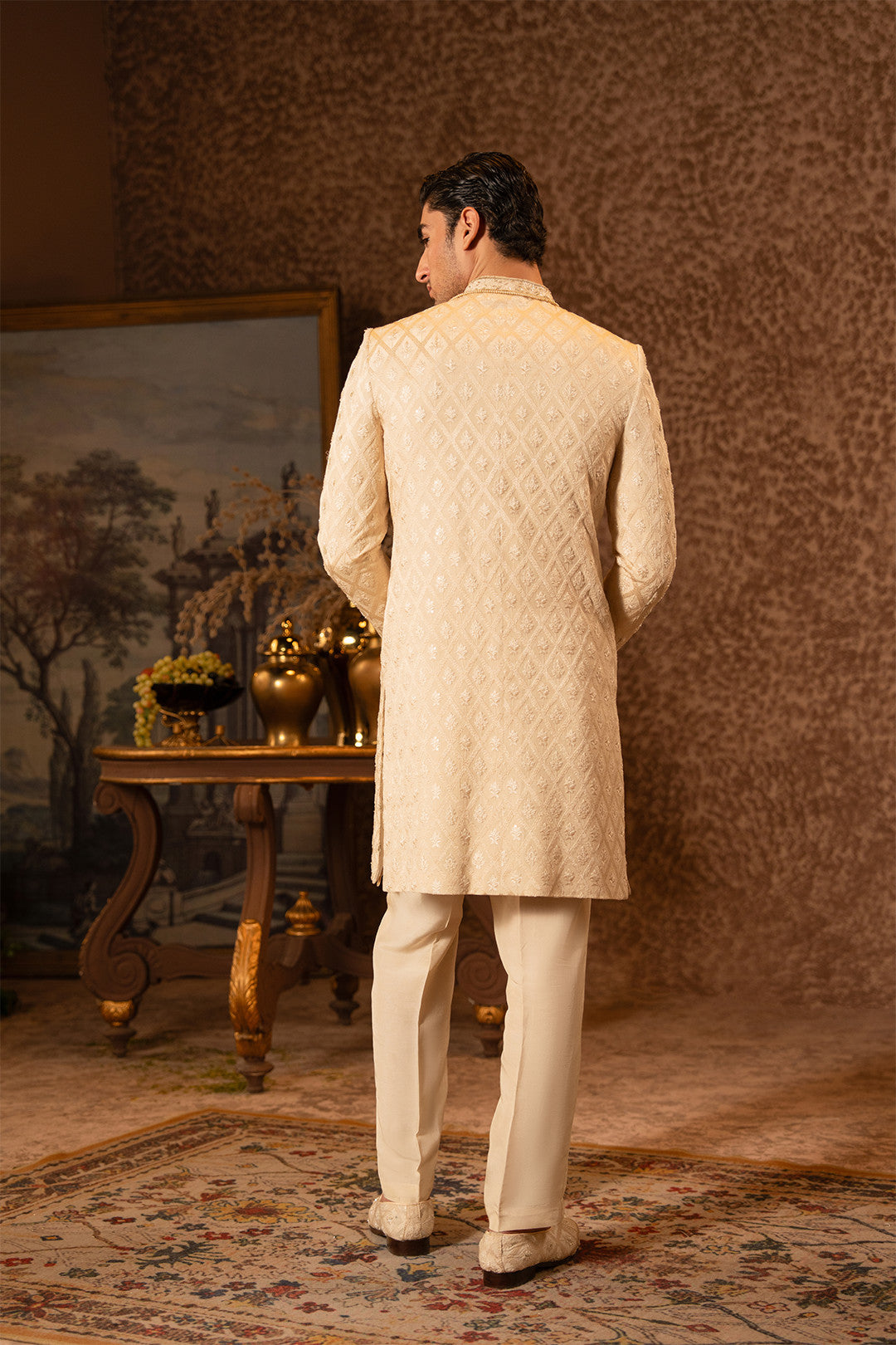 Work:This skin gold sherwani is crafted on an embroidered silk base,enhanced with fine hand embellishments in light gold tones.The detailing is executed with utmost finesse and precision,creating a perfect blend of luxury and sophistication.