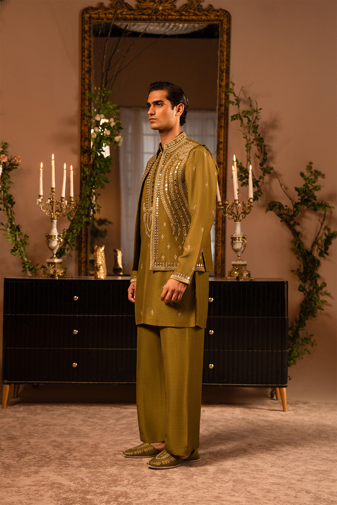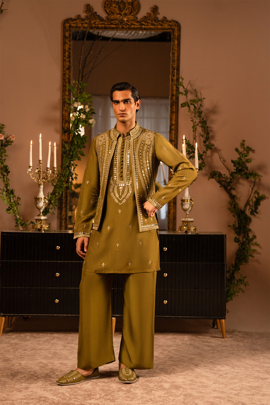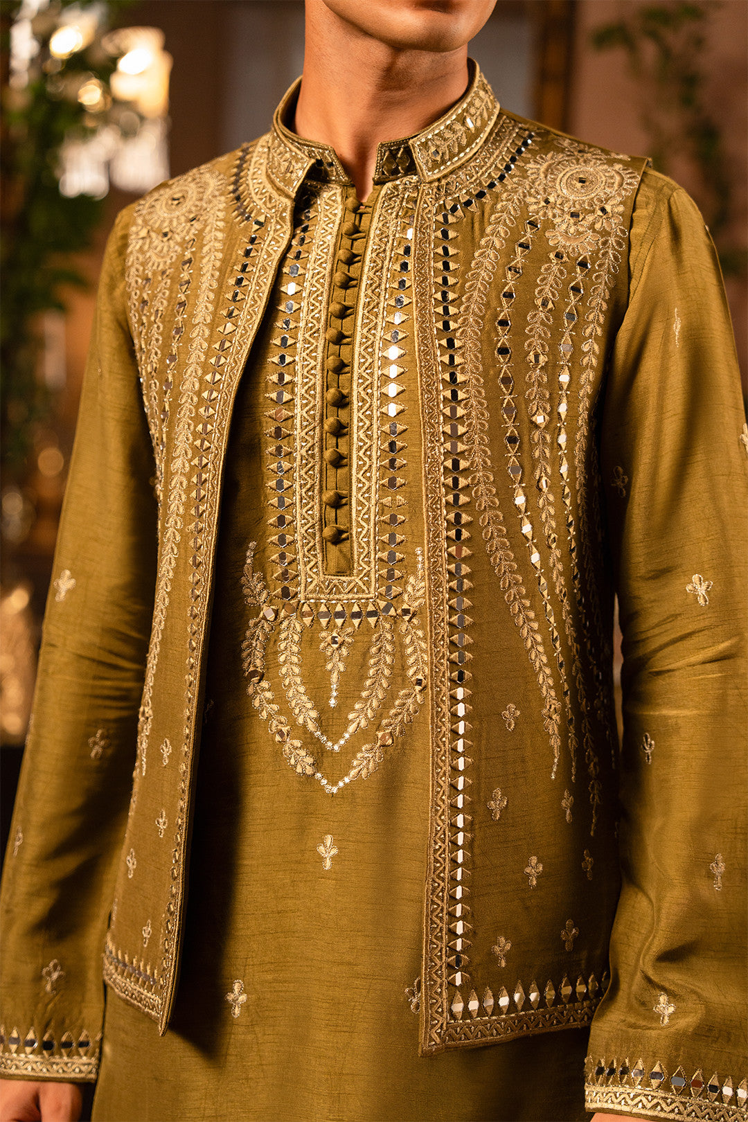 Work:This mehndi green waistcoat features intricate thread and tila embroidery enhanced with delicate mirror work, adding a festive and artistic appeal. The kurta carries the same detailing, paired with a bell-bottom trouser to complete a stylish and contemporary traditional look.