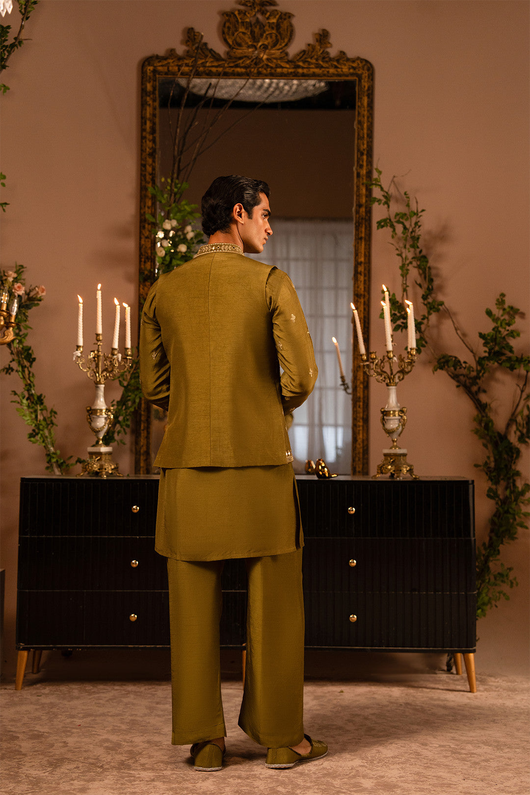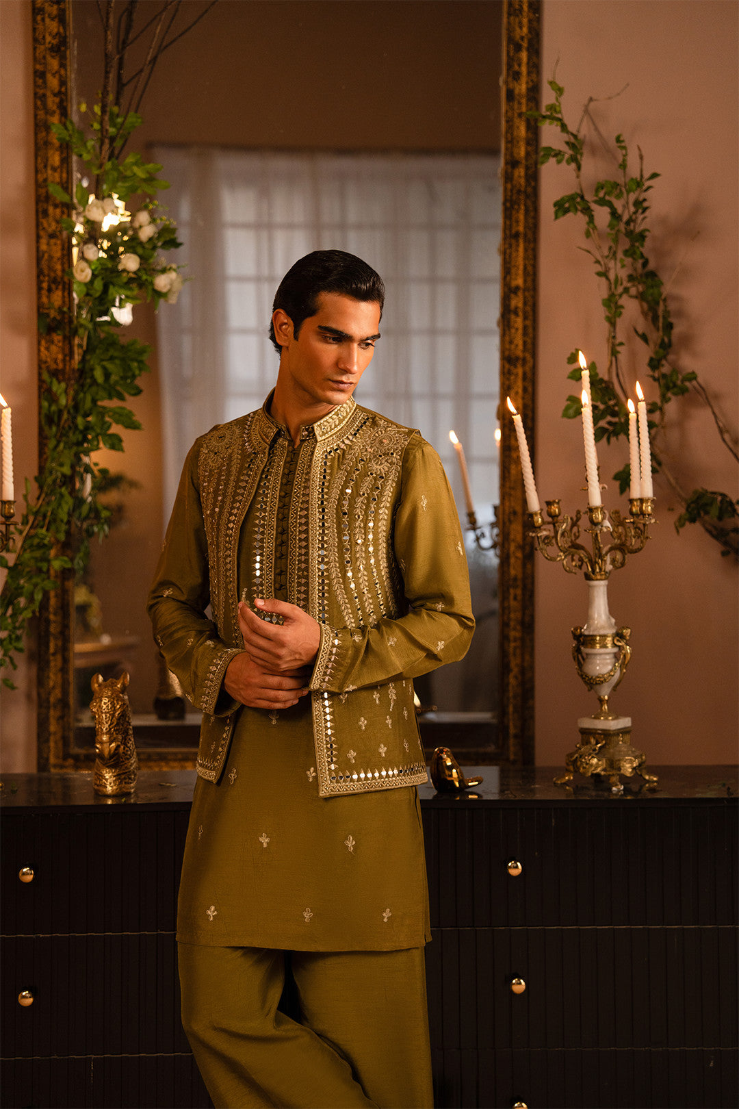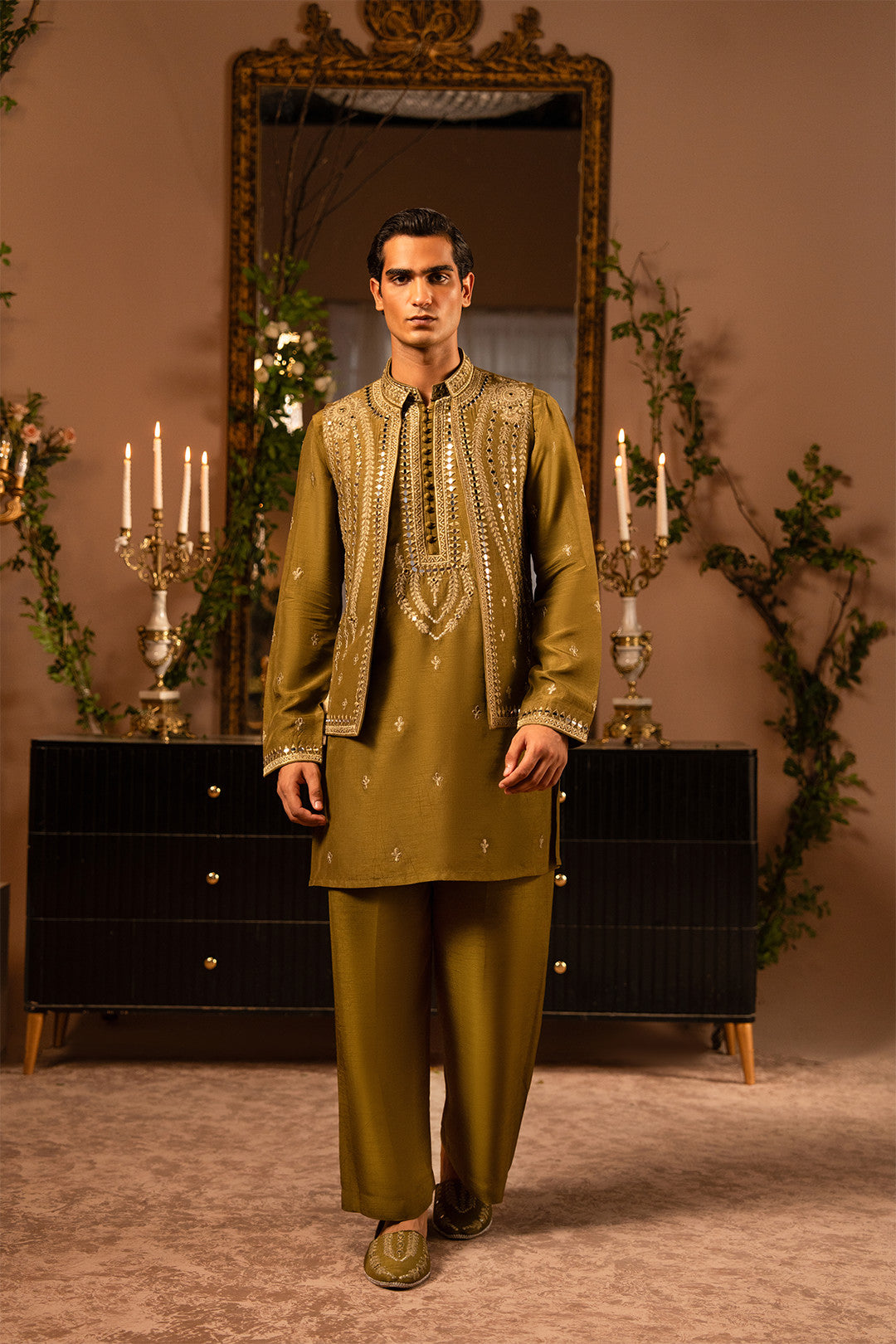 Work:This mehndi green waistcoat features intricate thread and tila embroidery enhanced with delicate mirror work, adding a festive and artistic appeal. The kurta carries the same detailing, paired with a bell-bottom trouser to complete a stylish and contemporary traditional look.