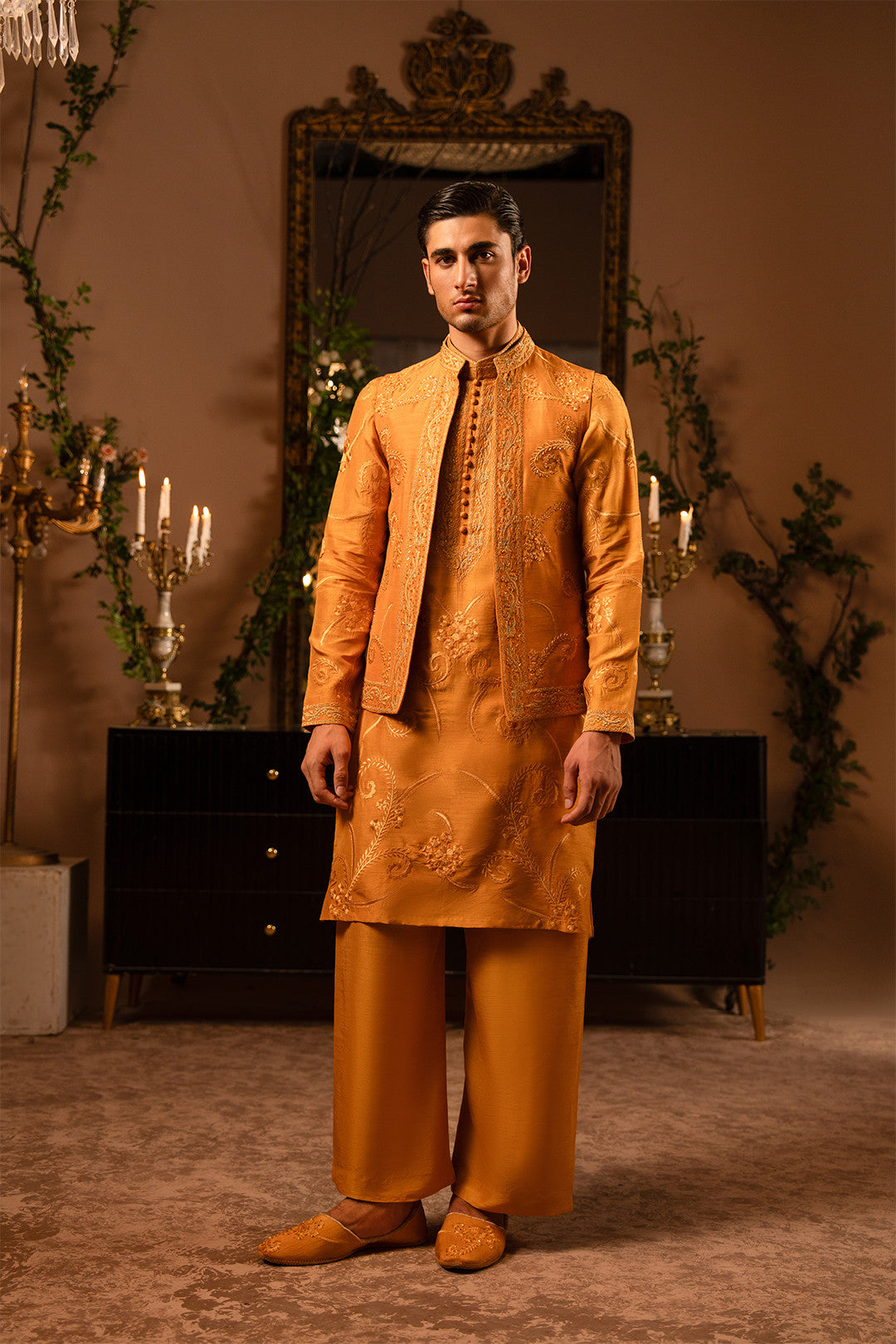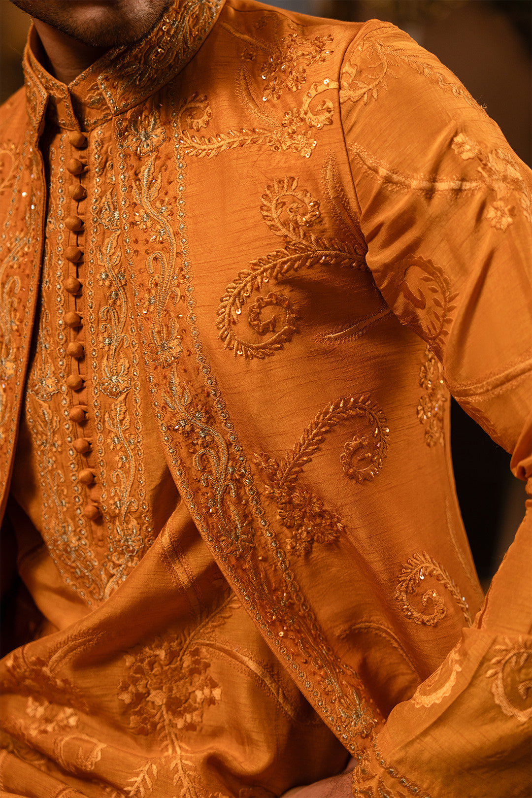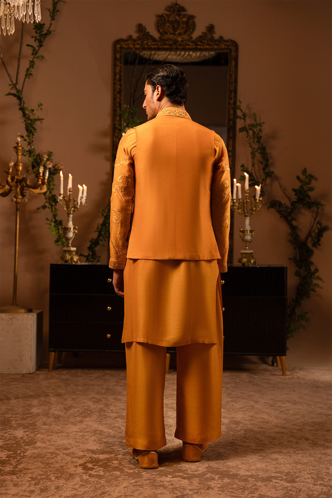 Work:This open-style rust orange waistcoat is adorned with fine thread embroidery and delicate hand embellishments, exuding refined elegance. The kurta features matching embroidery, paired with a bell-bottom trouser to create a contemporary twist on a classic traditional look.