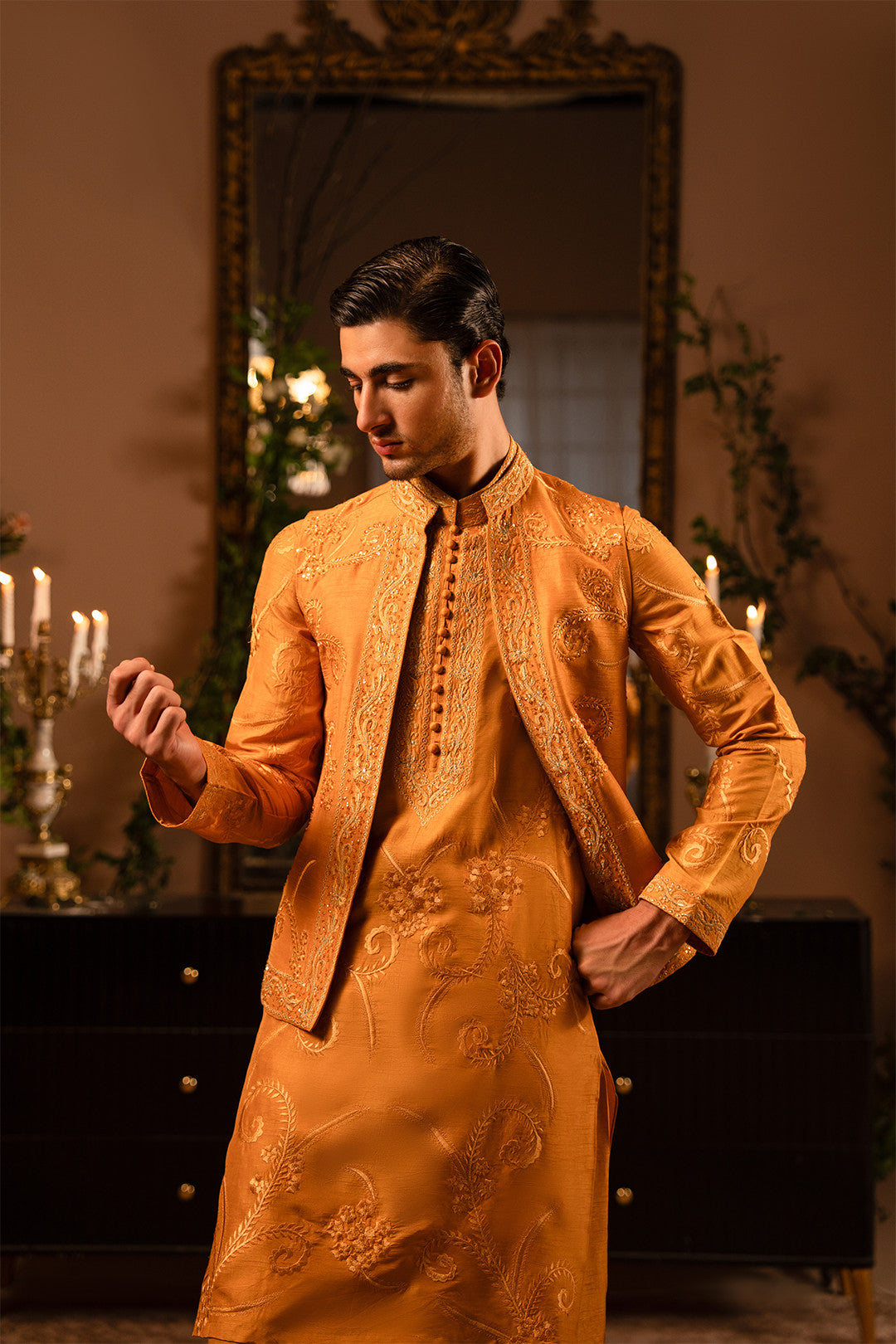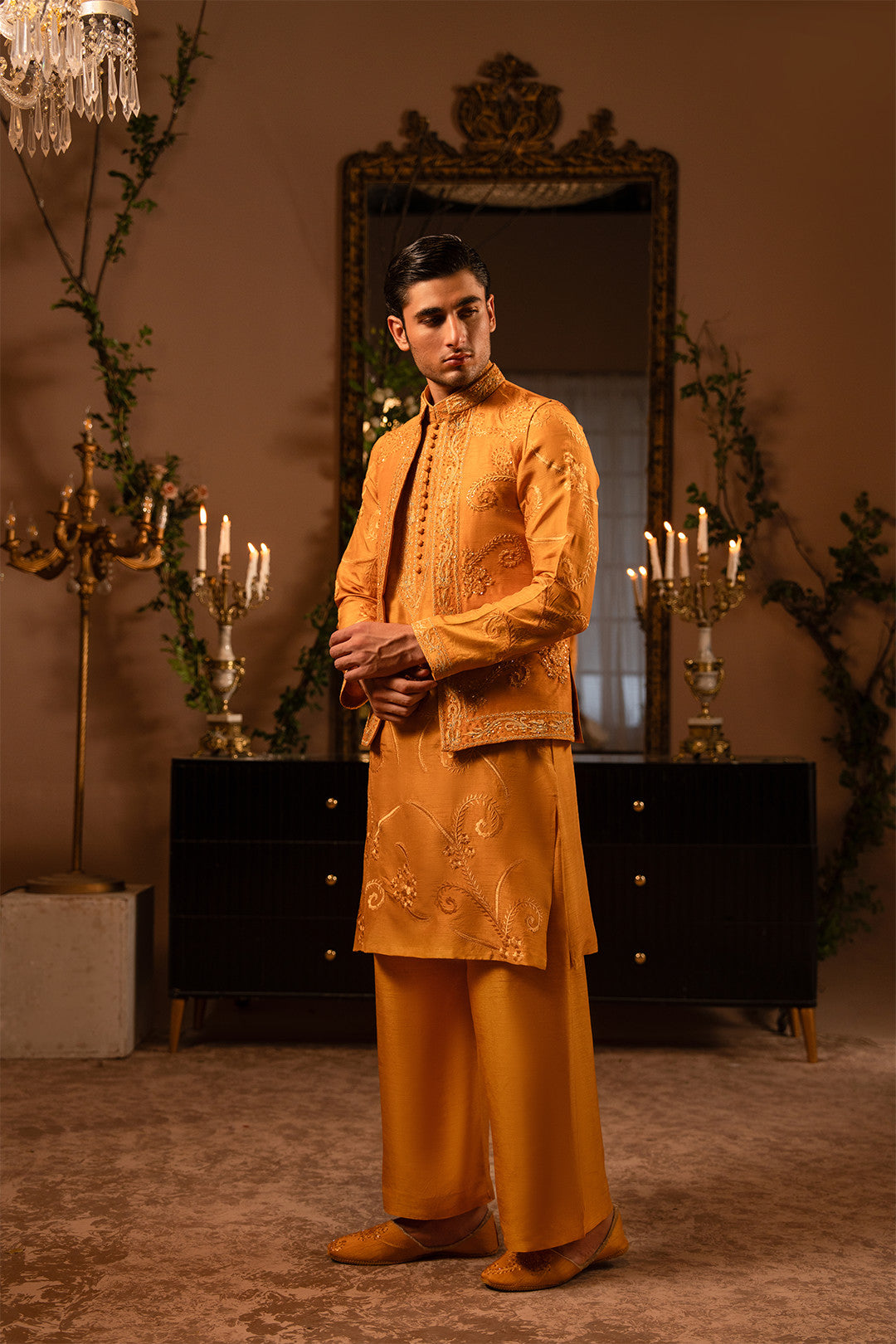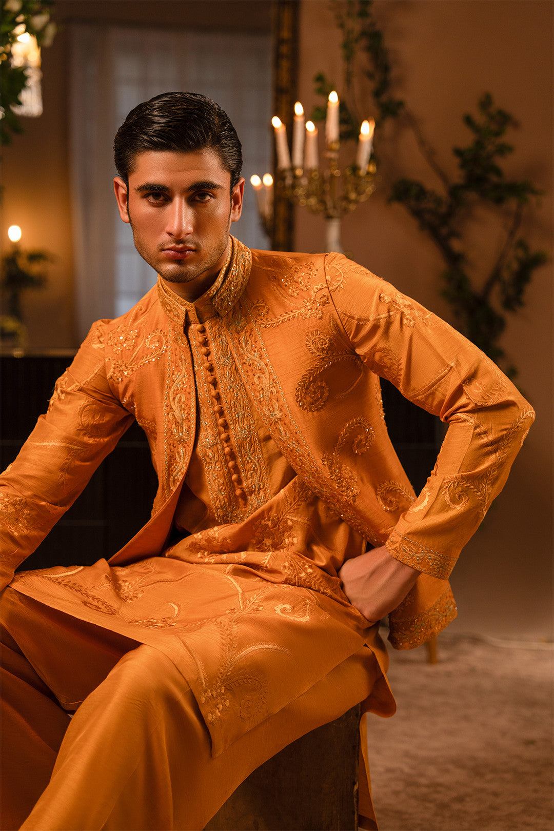 Work:This open-style rust orange waistcoat is adorned with fine thread embroidery and delicate hand embellishments, exuding refined elegance. The kurta features matching embroidery, paired with a bell-bottom trouser to create a contemporary twist on a classic traditional look.