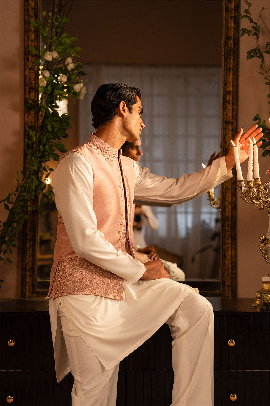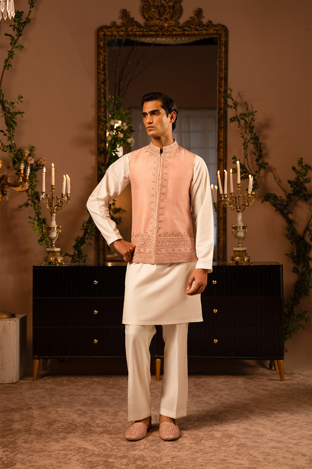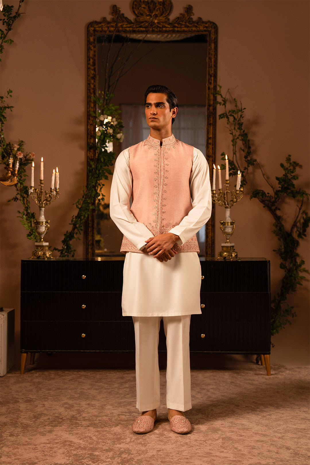 Work:This powder pink waistcoat is beautifully detailed with fine thread embroidery and delicate hand embellishments, exuding subtle sophistication. Paired with a white kurta pajama, it creates a refined and effortlessly classy ensemble perfect for daytime festivities and elegant occasions.