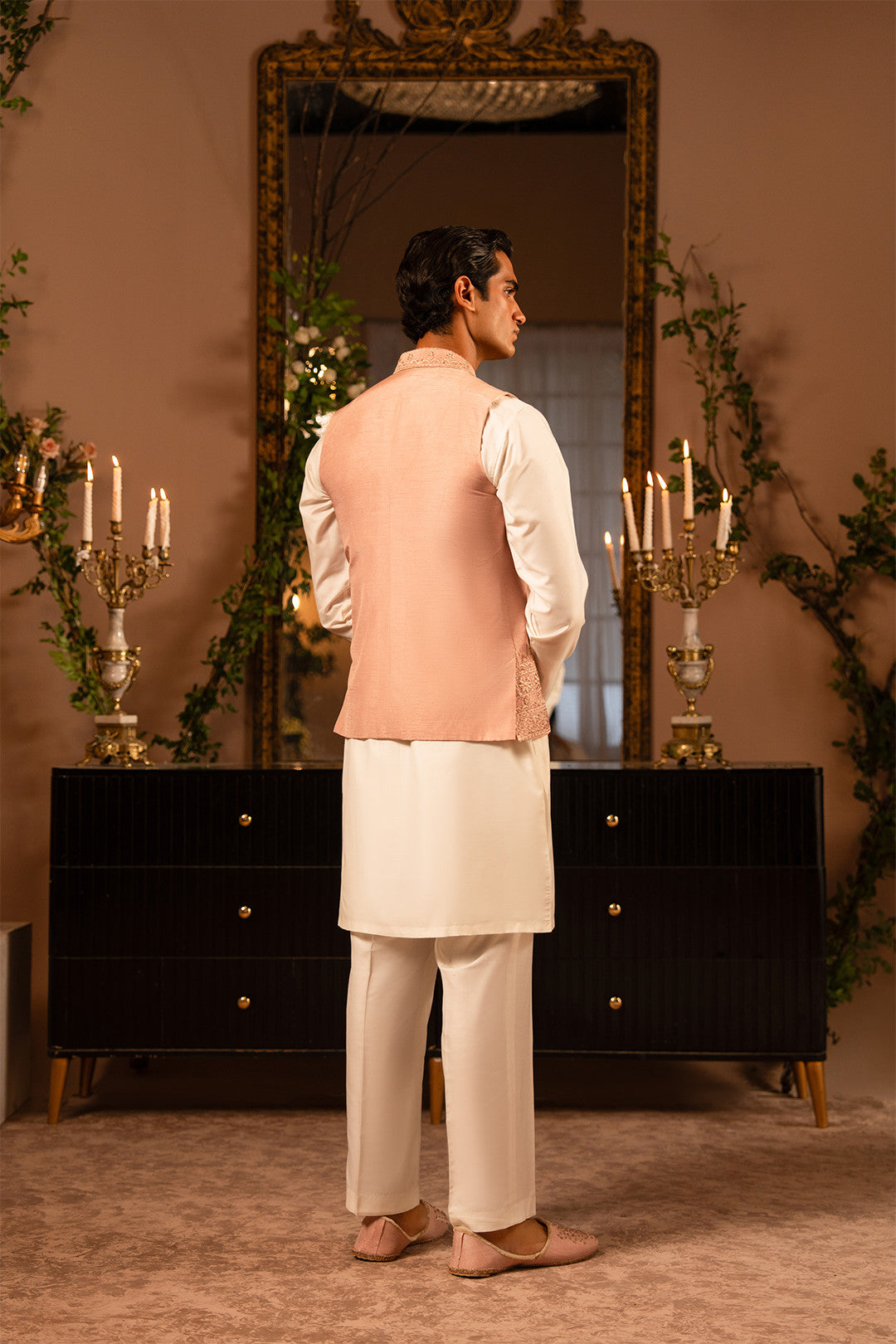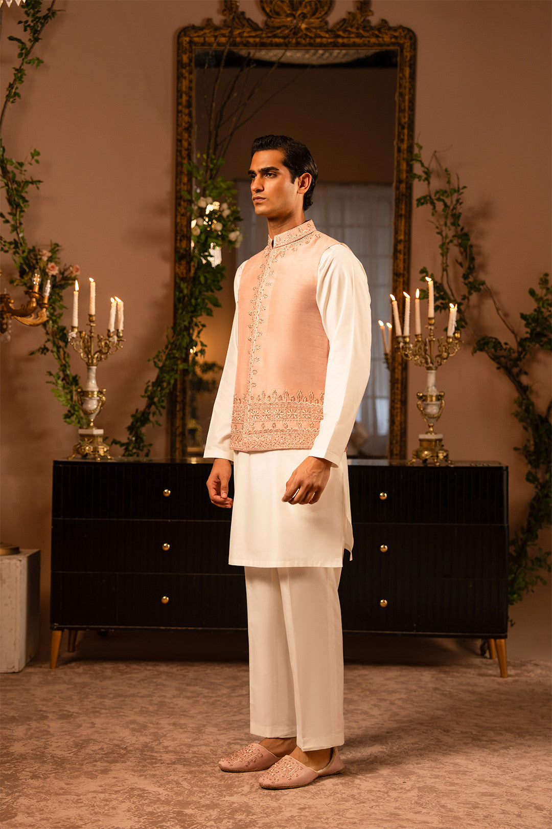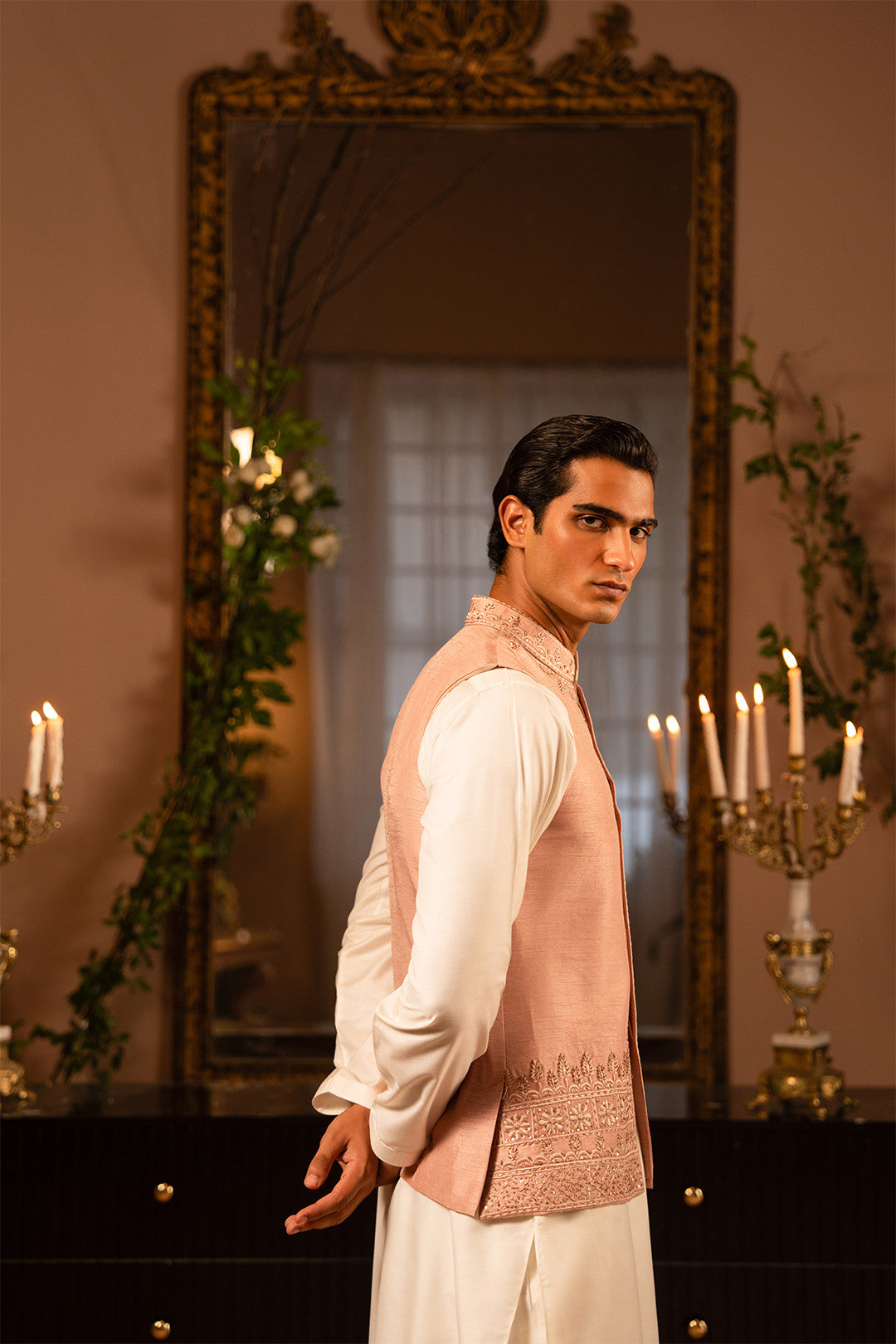 Work:This powder pink waistcoat is beautifully detailed with fine thread embroidery and delicate hand embellishments, exuding subtle sophistication. Paired with a white kurta pajama, it creates a refined and effortlessly classy ensemble perfect for daytime festivities and elegant occasions.