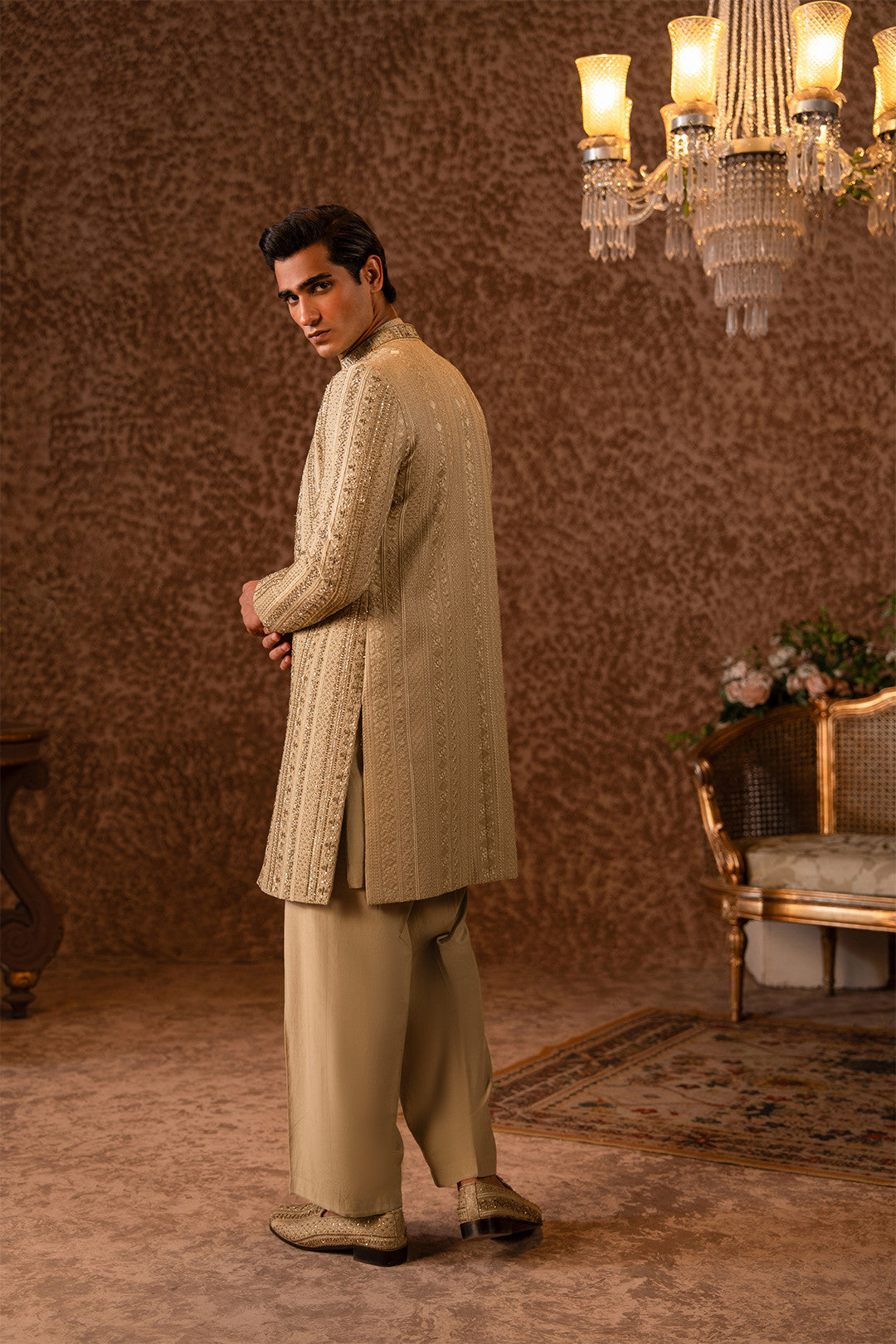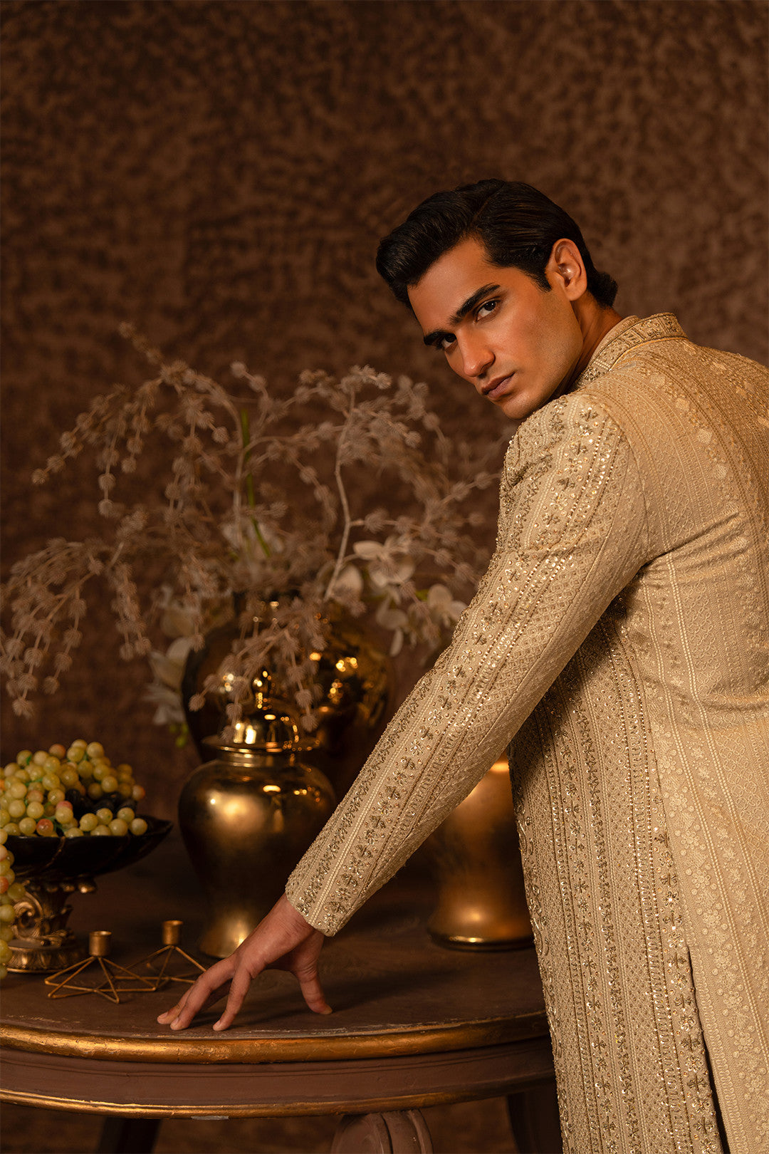 Work: Crafted from premium silk fabric, this sand beige sherwani features delicate thread embroidery, beautifully adorned with hand embellishments in light gold tones. The kora, dapka, and stones detailing is executed with fine precision, reflecting timeless elegance and royal finesse.