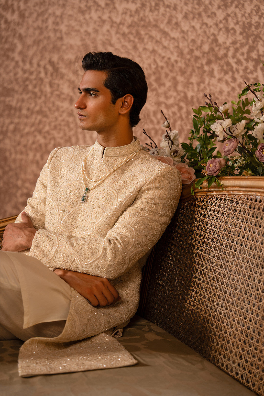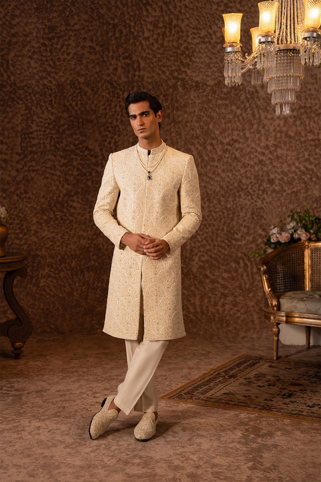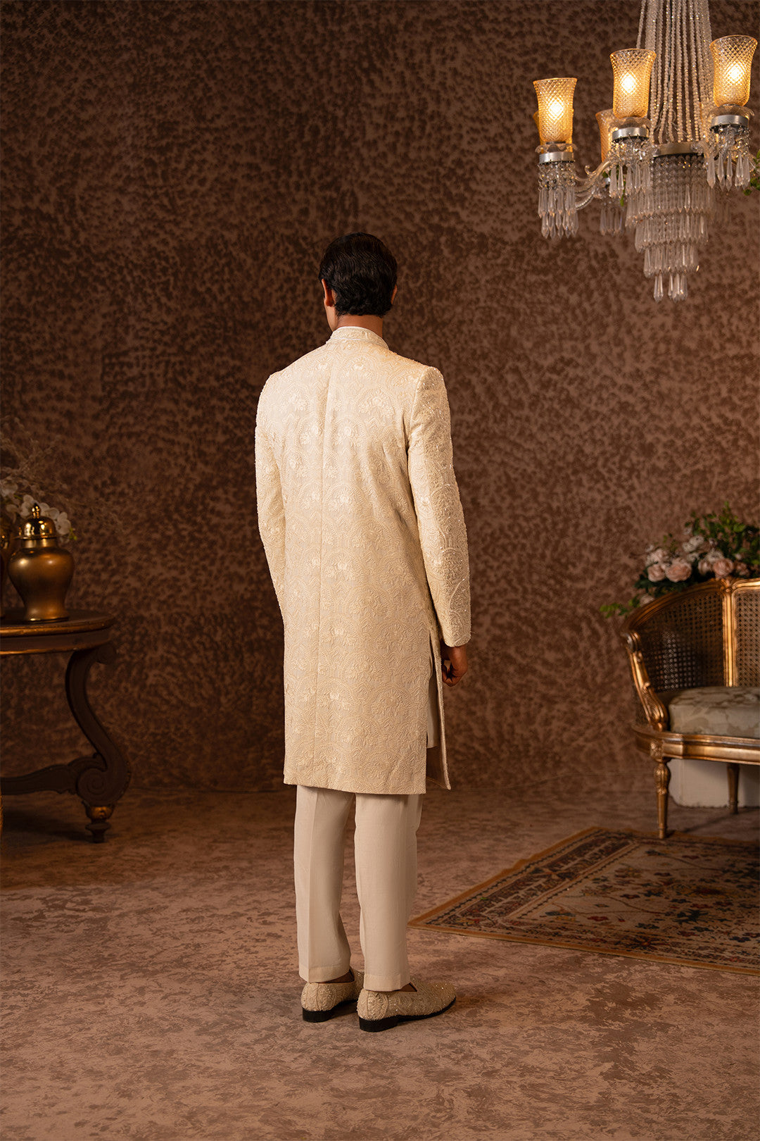Work: Crafted on an embroidered royal beige base, this sherwani features heavy hand embellishments done with fine precision and finesse, reflecting timeless elegance and regal charm.