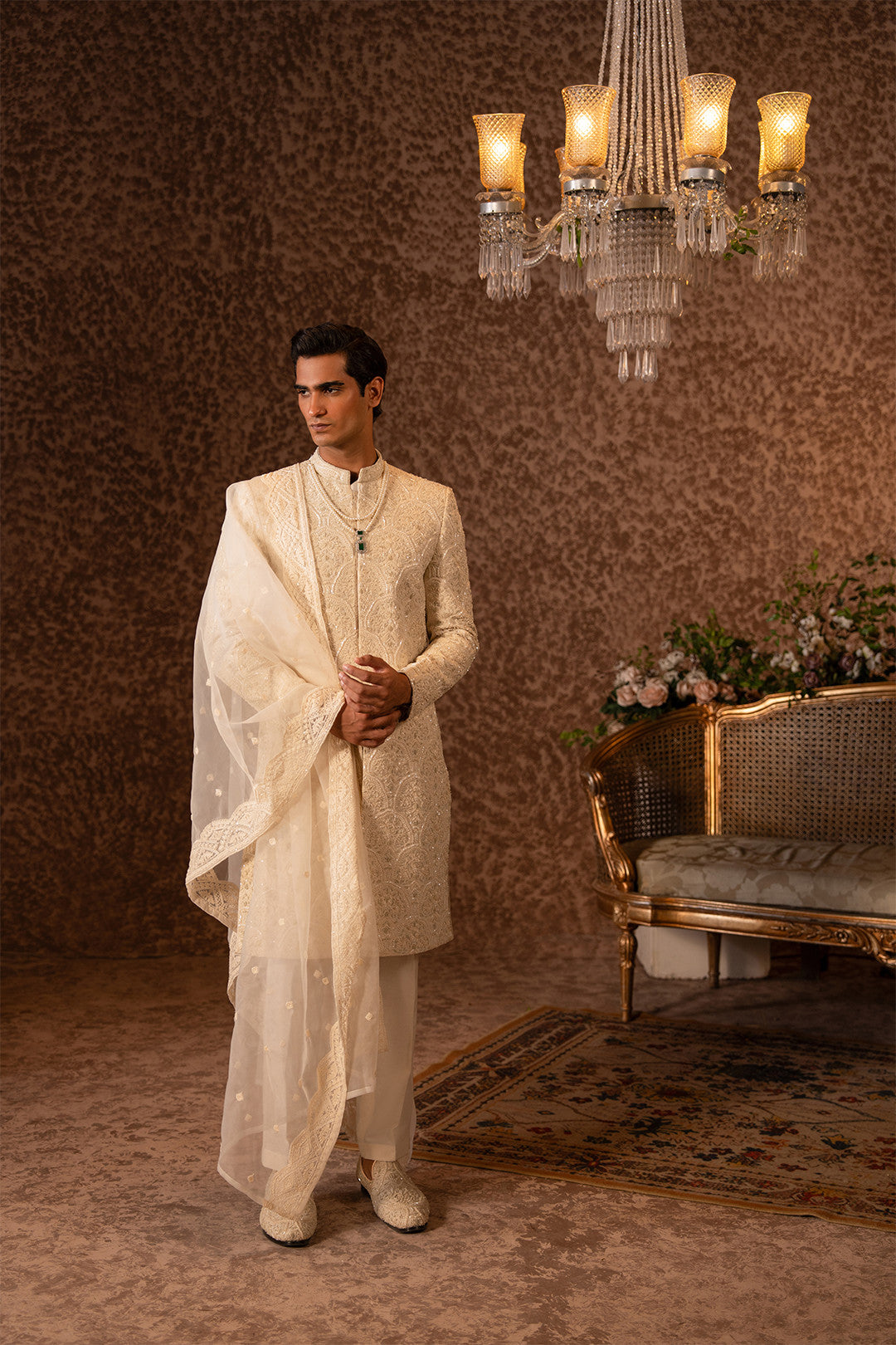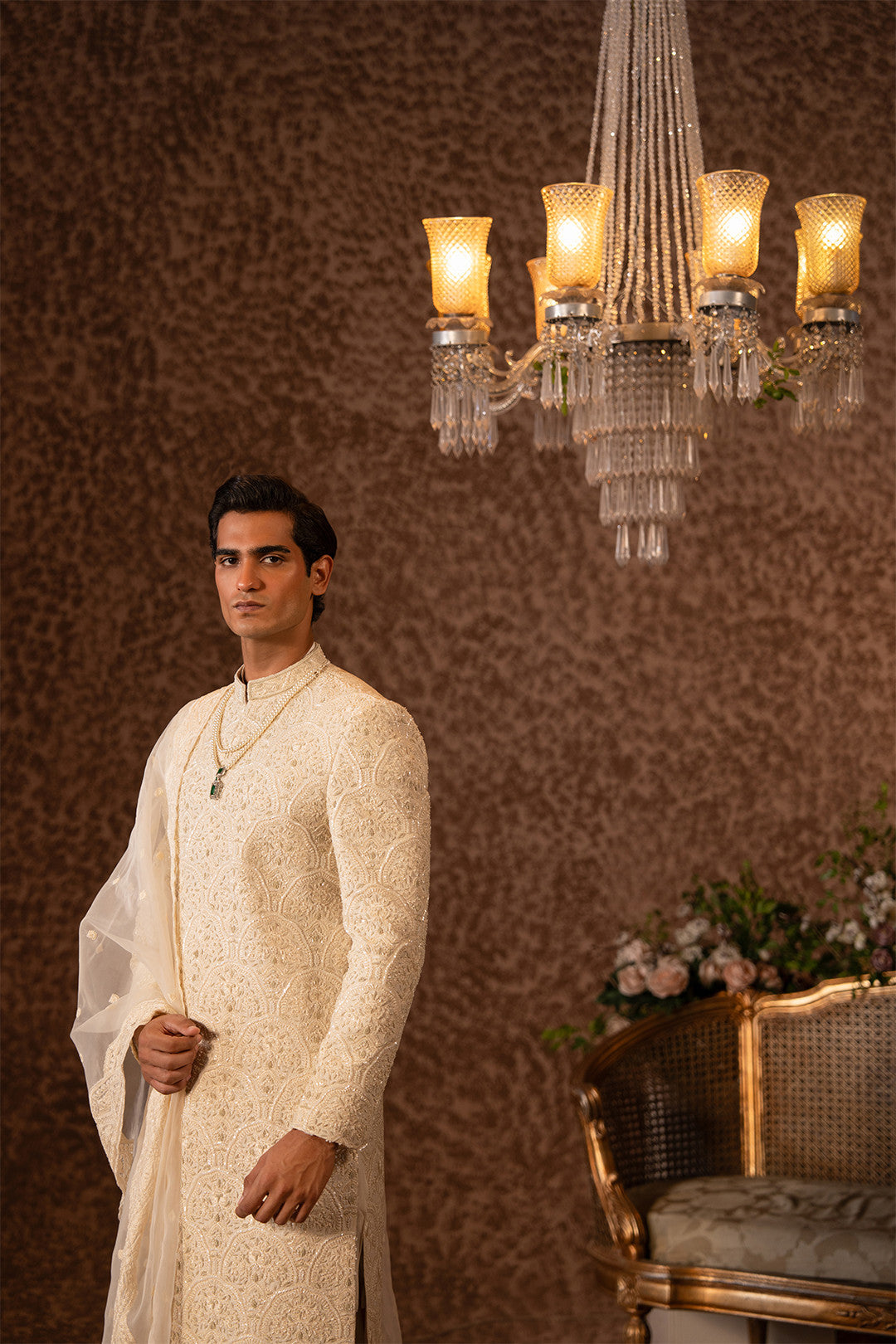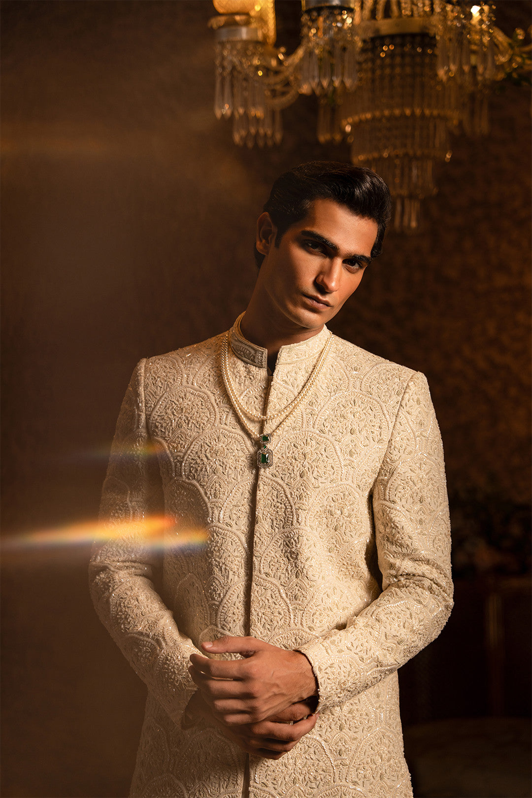 Work: Crafted on an embroidered royal beige base, this sherwani features heavy hand embellishments done with fine precision and finesse, reflecting timeless elegance and regal charm.